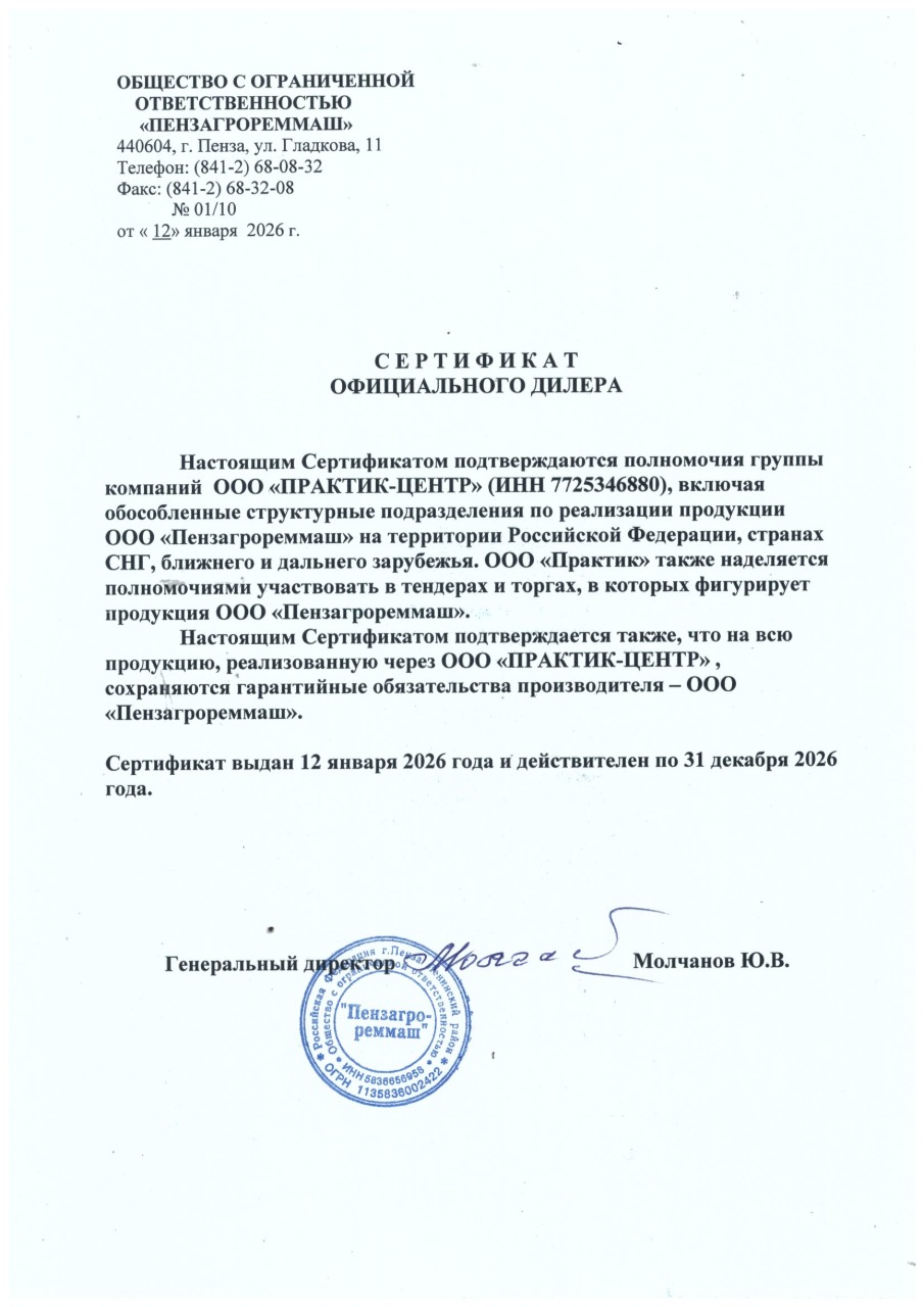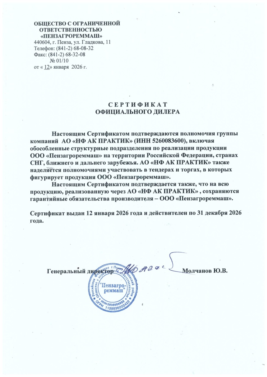 Сертификат дилера АО "Пинский опытно-механический завод"